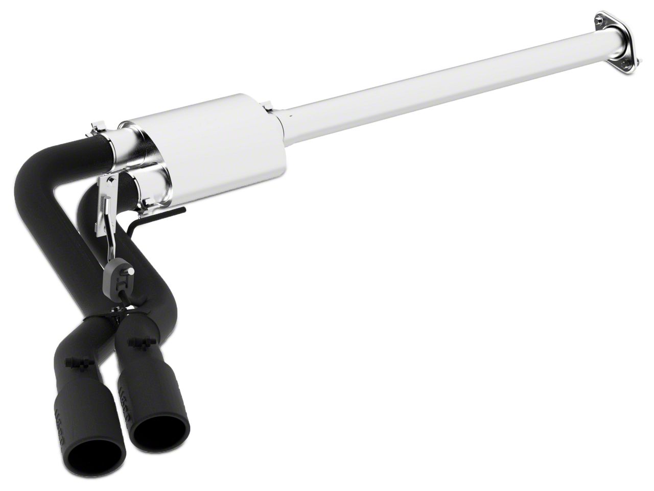 Featured Muffler. The exhaust system contains a single inlet/dual outlet muffler. This muffler connects to a pair of 4 inch black powdercoated stainless steel slant cut exhaust tips. These tips exit before your rear passenger tire.