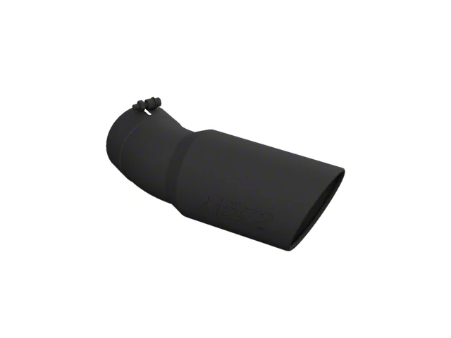 Exhaust Appearance. The MBRP Angled Cut Rolled End Exhaust Tip in Black is designed to enhance the appearance of your exhaust system. This 6-inch tip fits a 5-inch tailpipe and features an angled cut rolled end design, adding a sleek and aggressive look to your vehicle. The black powder-coated finish provides a stylish touch, complementing the overall aesthetic of your truck.