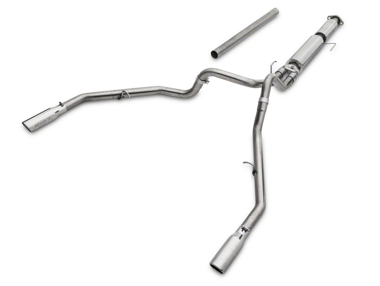 Installs with OEM Hangers. When installing the MBRP XP Series 2.5 in. Split Rear Exit Cat-Back Exhaust, you can simply bolt it onto your truck’s OEM hangers. You may find that you need to cut the piping to fit different bed and cab sizes.