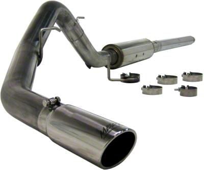 Reliable and Stylish. This cat-back system ensures a durable exhaust system featuring 3-inch mandrel-bent piping made with 409 stainless steel, coated in a natural finish, for durability no matter the daily mile count. A single inlet/outlet bullet-style muffler hooks up to the 3.5-inch stainless steel rear exhaust, the MBRP logo engraved into its polished tip.