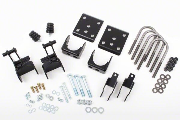 Construction and Features. This kit includes high-quality components such as U-bolts, lift hangers, shock extenders, bump stops, and an axle flip kit. Designed with durability in mind, the bolt-on components ensure a secure fit while maintaining reliable suspension performance. The included installation hardware makes for a comprehensive solution.