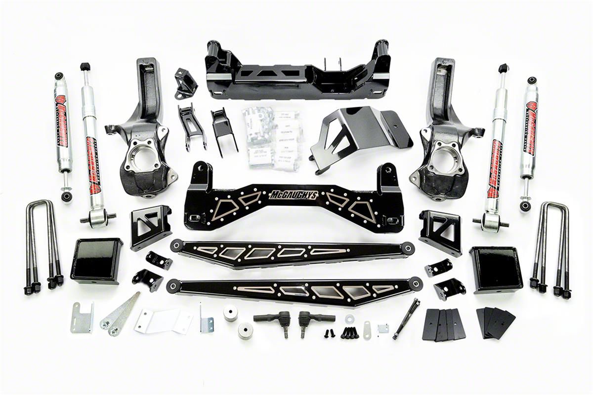 Top-Notch Functionality. The McGaughys Suspension 7 to 9-Inch Premium Suspension Lift Kit is a must-have for any vehicle owner who wants to take their vehicle to the next level. This kit features a sleek black powder-coated finish with stainless steel inserts, adding a stylish touch to your vehicle's appearance. It also provides 7 to 9 inches of lift, increasing ground clearance and allowing you to tackle more challenging terrain without damaging your vehicle. Additionally, this lift kit improves road handling, ensuring a smooth and comfortable ride quality while you're driving.