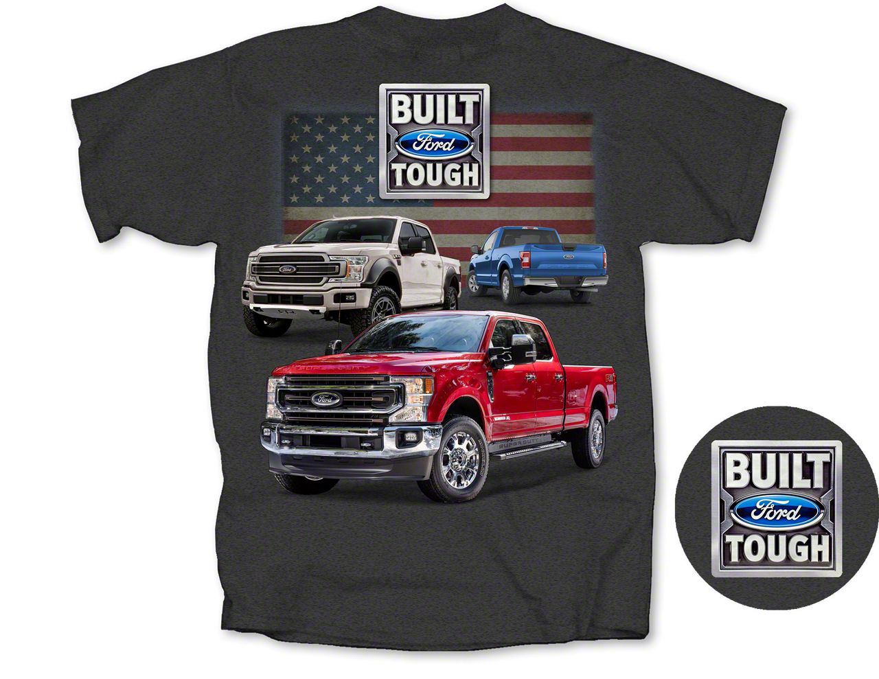 Ford Truck-Inspired Graphic. If you’re looking for an exclusive off-road outfit, then opt for this Men’s RWB Ford Trucks T-Shirt in Charcoal. This t-shirt is printed with the American Flag in the background and red, white, and blue Ford trucks in the foreground. It also includes the Ford logo and "Built Ford Tough" tagline, allowing you to show off your pride as a Ford Truck owner.