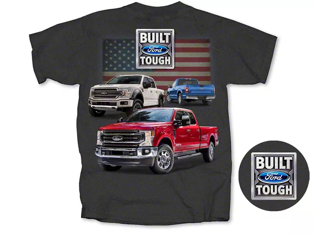 Ford Truck-Inspired Graphic. If you’re looking for an exclusive off-road outfit, then opt for this Men’s RWB Ford Trucks T-Shirt in Charcoal. This t-shirt is printed with the American Flag in the background and red, white, and blue Ford trucks in the foreground. It also includes the Ford logo and "Built Ford Tough" tagline, allowing you to show off your pride as a Ford Truck owner.