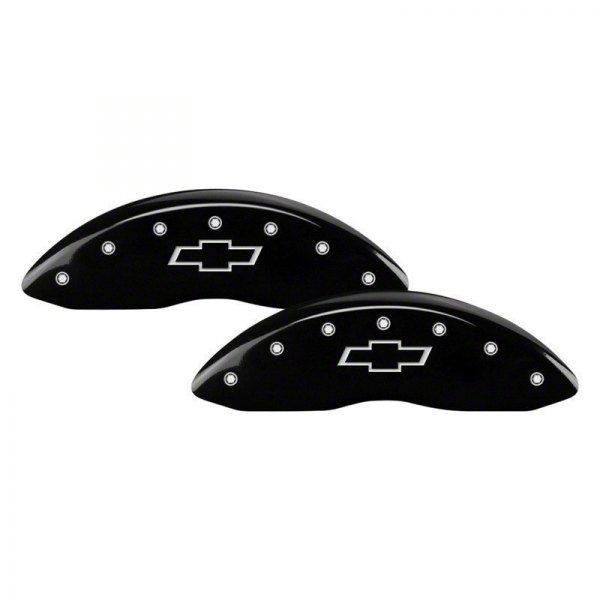 Visual Upgrade. MGP Brake Caliper Covers are designed to enhance the visual appeal of your vehicle, adding a touch of elegance with their glossy black finish and stylish Chevrolet Bowtie logo. These covers are not just about aesthetics; they also serve to reduce brake dust on your wheels, keeping them cleaner. Crafted from high-quality aluminum, these covers are engineered for durability, ensuring they withstand the rigors of daily driving. The set includes covers for both front and rear models, offering a complete upgrade for your vehicle's appearance.