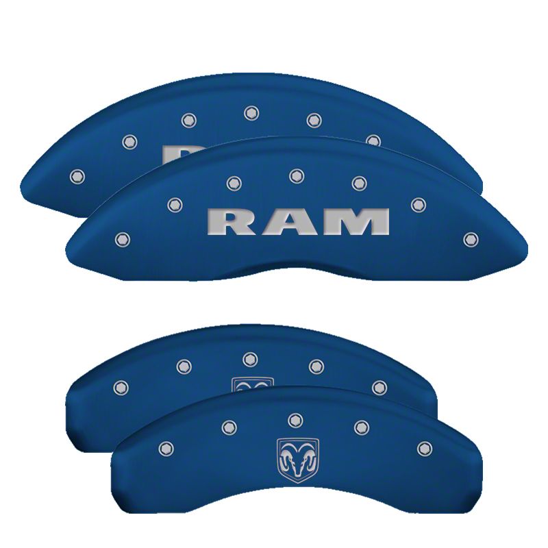 MGP Brake Caliper Covers with RAM and RAMHEAD Logo; Blue; Front and Rear (19-26 RAM 1500 w/ Alternate Rear Calipers)Find parts that fit my vehicle