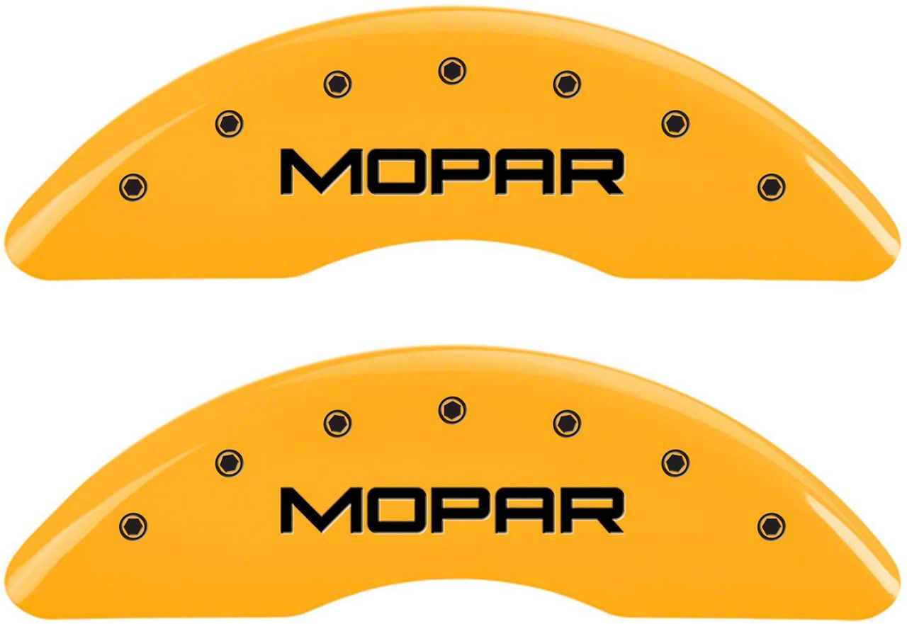 Mustang Styling. This set of 4 Yellow MGP Caliper Covers are a great way to set off your rims. These Covers feature the modern "MOPAR" logo and these Officially Licensed MGP Caliper Covers will give your RAM a big brake race ready look that will be sure to turn heads.