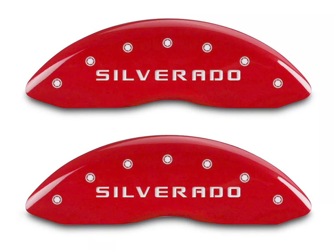Exclusive Custom Styling. MGP's Red Caliper Covers are the perfect addition if you are looking to transform your Silverado into a race ready beast. The calipers are a perfect aftermarket replacement or just a good addition your Silverado for those who are looking to add a custom style to their truck. The red calipers are guaranteed to impress in looks and in construction.