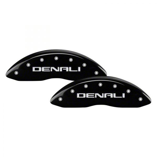 Sleek Aesthetic Upgrade. Elevate the look of your Sierra 2500 HD with these MGP Brake Caliper Covers with Denali Logo; Black; Front and Rear. These black covers add a touch of sophistication and style to your vehicle, making it stand out. Designed to conceal unsightly brake hardware, these covers instantly transform the appearance of your wheels, giving them a clean, high-performance look.