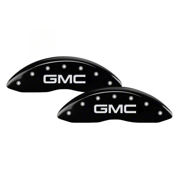 Elite Aesthetic Enhancement. The MGP Brake Caliper Covers with GMC Logo; Black; Front and Rear are the ultimate solution for Sierra 2500 HD owners looking to hide unsightly, weathered calipers with a sleek, professional finish. These covers provide a high-end, custom-painted look without the mess or permanence of actual paint, instantly elevating the profile of your Sierra. By filling the void behind your wheels with a bold black finish and the iconic GMC branding, the MGP Brake Caliper Covers with GMC Logo; Black; Front and Rear transform your vehicle's stance into one of refined power and polished detail.