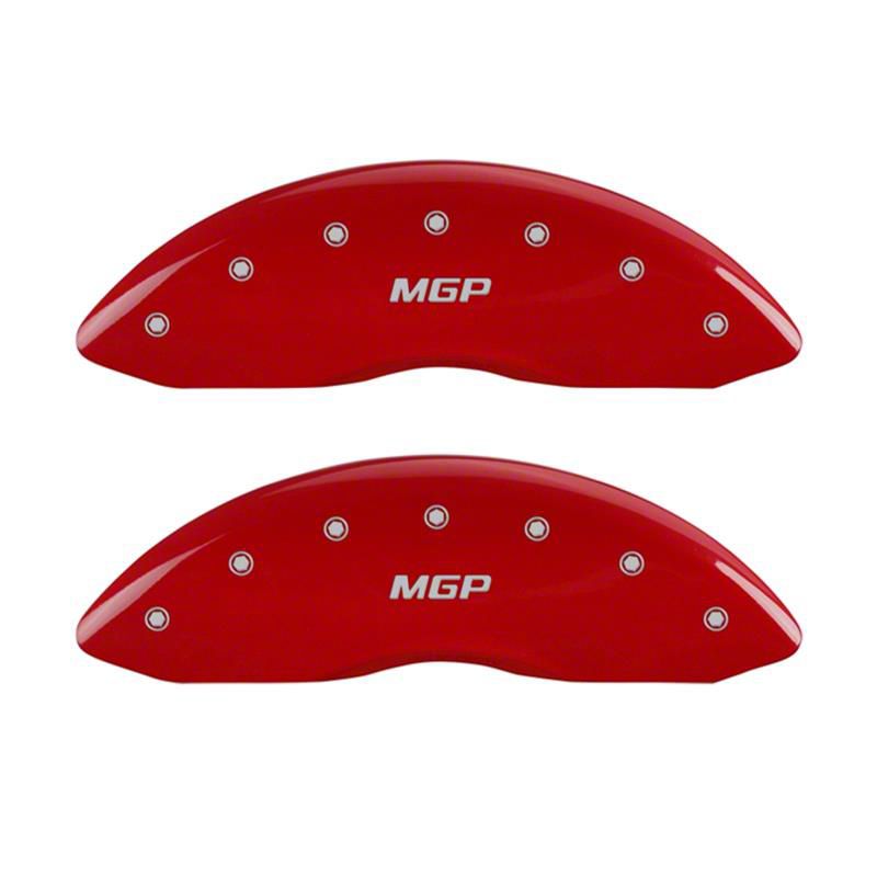 Cleaner Wheel Appearance Through Dust Reduction. The MGP Brake Caliper Covers with MGP Logo; Red; Front Only help reduce visible brake dust buildup by redirecting particle spread, resulting in cleaner-looking wheels for longer periods. This subtle improvement minimizes frequent cleaning and helps maintain a sharper, more polished overall appearance.