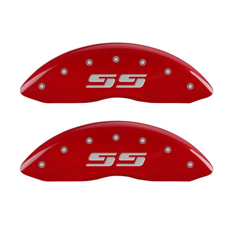 Durable Aerospace-Grade Aluminum for Lasting Strength. The MGP Brake Caliper Covers with Silverado Style SS Logo; Red; Front Only are built from high-quality 6061‑T6 aluminum, providing excellent rigidity, heat resistance, and corrosion protection. This premium-grade construction keeps the covers looking sharp and performing reliably through daily driving, temperature changes, and consistent brake heat cycles.
