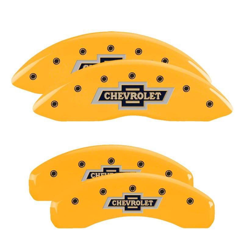 Head-Turning Calipers. Dress up your OEM calipers in a stylish way with the MGP Yellow Caliper Covers with 100 Anniversary Logo for the Front and Rear. This front and rear set of 4 calipers comes with an engraved logo for a distinct and eye-catching look. These covers are not just made for looks, they reduce the operating temperatures of the calipers, effectively extending their service life.