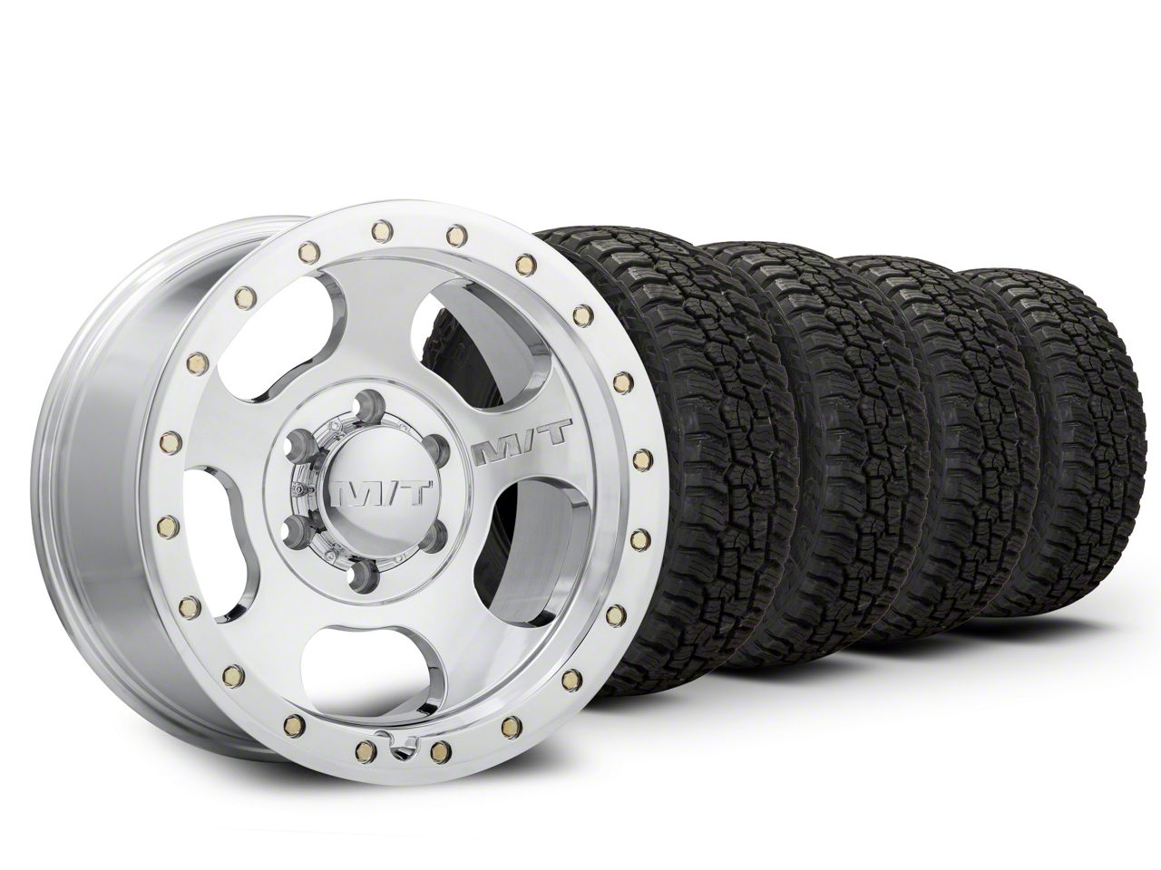Mounted and Balanced Wheel and Tire Kit. This wheel and tire combo kit features (4) 17x9 Mickey Thompson Canyon Pro Polished Wheels and (4) Mickey Thompson Baja Boss A/T 35" - 35x12.50R17 tires that have been put together into an easy to buy kit that arrives to your door already mounted and balanced ready to be installed on your vehicle.