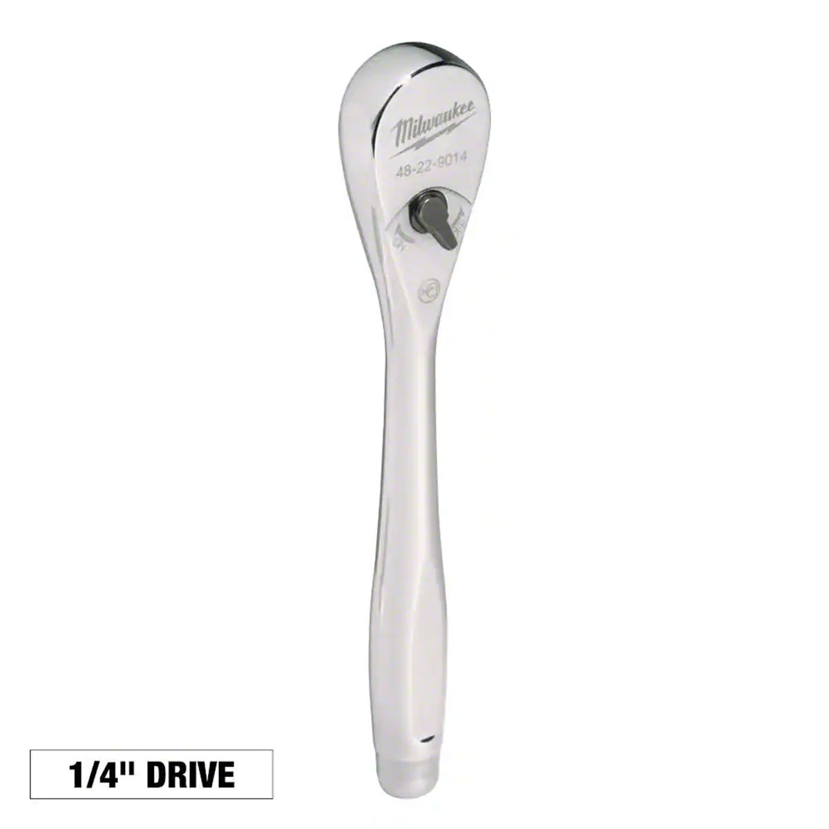 The Milwaukee MILWAUKEE® 1/4" drive ratchet gives users just 4° of arc swing, allowing them to access their work in tighter spaces whether is under the hood of a car or the middle of a remodel. Its slim profile design and the flush directional lever of the ratchet tool offers better accessibility while using it. The construction of the tool allows for greater fastener access as well as an increase in strength during heavy-duty applications. The all-chrome finish allows for easy cleaning while iving the ratchet a professional look. Our ratchet is backed by our Lifetime Guarantee.