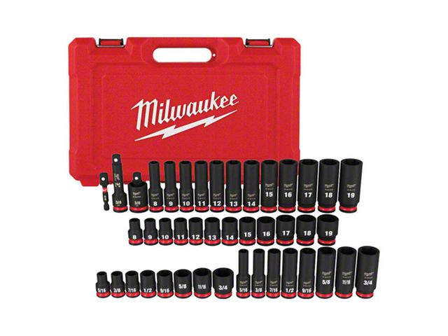 The MILWAUKEE® 43-Piece SHOCKWAVE Impact Duty™ 3/8 in. Drive SAE & Metric Deep 6 Point Socket Set features the boldest, longest-lasting markings and extreme impact durability in high torque applications. The stamped and ink-filled size marking makes selecting the right socket every time easy throughout the life of the socket. These Milwaukee sockets are engineered with high strength forged steel for optimized performance in heavy-duty applications. The non-slip hex geometry prevents fastener rounding, and a dual-hole design and ring groove allow for easy socket attachment and removal. The storage cases are impact resistant and nest together for easy stacking and storage. All SHOCKWAVE Impact Duty™ ™ Sockets backed by a Lifetime Guarantee and meet ASME industry standards.
