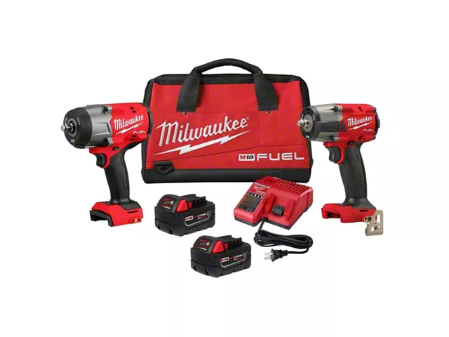 The M18 FUEL™ 1/2” HTIW & 3/8” MTIW Automotive Combo Kit includes The M18 FUEL™ 1/2" High Torque Impact Wrench w/ Friction Ring that is the most power dense impact wrench in its class, provides greater access in tight spaces, and maximizes productivity through faster removal speeds. The POWERSTATE™ Brushless Motor delivers up to 1,100 ft-lbs of Fastening Torque and 1,500 ft-lbs of Nut-Busting Torque when paired with The M18 REDLITHIUM™ XC5.0 Resistant battery, while the compact size at 7.6" in length gives users greater access in tight spaces. The M18 FUEL™ 1/2” High Torque Impact Wrench w/ Friction Ring maximizes productivity on the jobsite and in the shop by removing stubborn bolts and fasteners faster than cordless competitors. The patented battery isolation system provides a secure battery connection and controls vibration transmitted to the pack. The M18 FUEL™ 3/8" Mid-Torque Impact Wrench w/ Friction Ring delivers the best power to weight ratio, most access in tight spaces, and faster removal speed. It provides 600 ft-lbs of nut-busting torque and only weighs 5.0 lbs, making it extremely versatile, capable of performing a wide variety of applications, such as removing large bolts or lug nuts. Tri-LEDs surround the anvil on both tools to deliver brighter light with fewer shadows. The M18 REDLITHIUM™ XC5.0 Resistant Battery Packs included provide increased protection against oils, greases, & solvents.