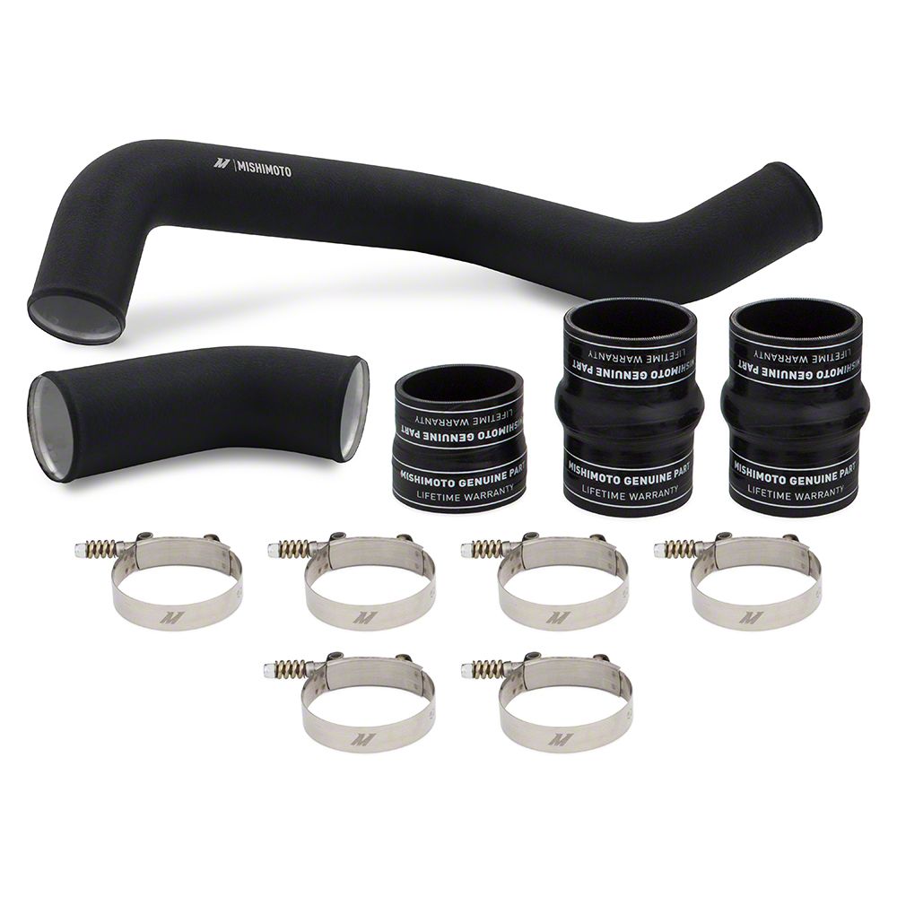 Description. Improve the power and efficiency of your 2017-2019 Chevrolet/GMC 6.6L Duramax L5P with the Mishimoto hot-side intercooler pipe and boot kit. The factory hot-side pipe for the L5P is a measly 2.5" that chokes the engine, while the tight bends and built-in resonator create even more restriction. The Mishimoto hot-side intercooler pipe is 3" in diameter throughout and eliminates the factory resonator to significantly increase airflow, resulting in more power potential. Mishimoto designed this pipe as two pieces, like the factory pipe, for ease of install. This kit also includes our silicone boots with DuraCore™ technology. Mishimoto DuraCore™ technology is the synthetic material that comprises the innermost layer of all Mishimoto silicone diesel boots. Compared to normal silicone, DuraCore™ provides superior resistance to heat, pressure, fuel, and oil. This effectively increases the life of our boots by preventing leaks and blowouts.