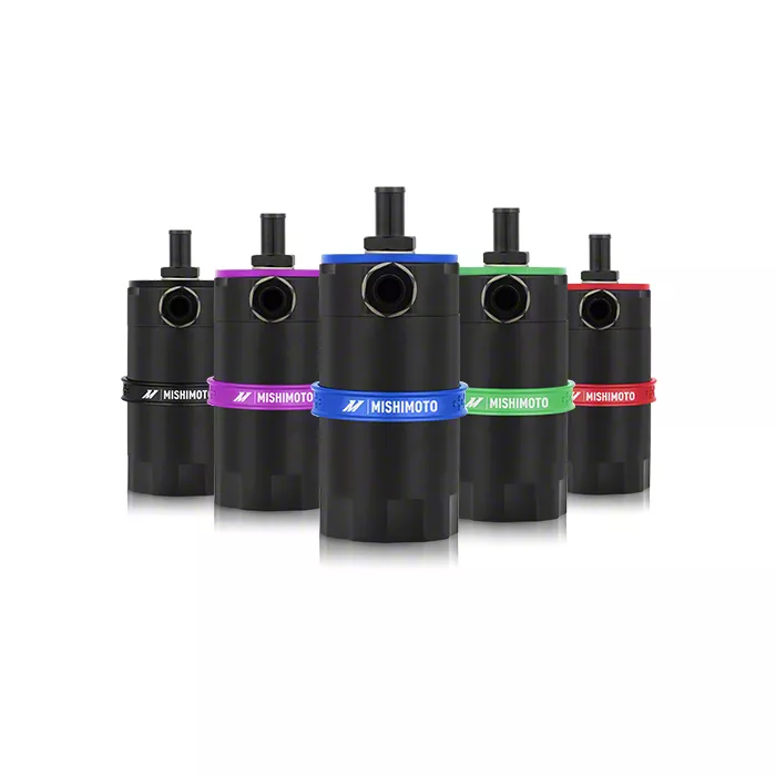 Reliable Operation. This Mishimoto Baffled Oil Catch Can was created to collect oil particles from PCV air that would otherwise be returned to your intake. Custom grooves in the catch can's inlet turbulize the air for longer, ensuring that all of the oil settles to the bottom of the can and the only clean air passes through the bronze filter to the intake. Under race circumstances, an internal baffle protects the collected oil from splashing everywhere.