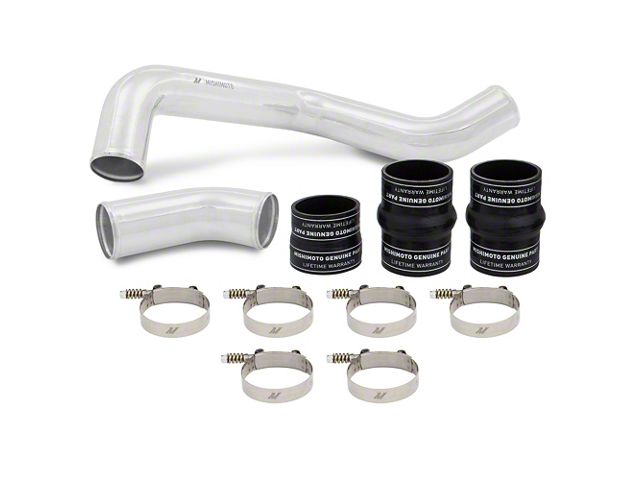 Description. Improve the power and efficiency of your 2017-2019 Chevrolet/GMC 6.6L Duramax L5P with the Mishimoto hot-side intercooler pipe and boot kit. The factory hot-side pipe for the L5P is a measly 2.5" that chokes the engine, while the tight bends and built-in resonator create even more restriction. The Mishimoto hot-side intercooler pipe is 3" in diameter throughout and eliminates the factory resonator to significantly increase airflow, resulting in more power potential. Mishimoto designed this pipe as two pieces, like the factory pipe, for ease of install. This kit also includes our silicone boots with DuraCore™ technology. Mishimoto DuraCore™ technology is the synthetic material that comprises the innermost layer of all Mishimoto silicone diesel boots. Compared to normal silicone, DuraCore™ provides superior resistance to heat, pressure, fuel, and oil. This effectively increases the life of our boots by preventing leaks and blowouts.