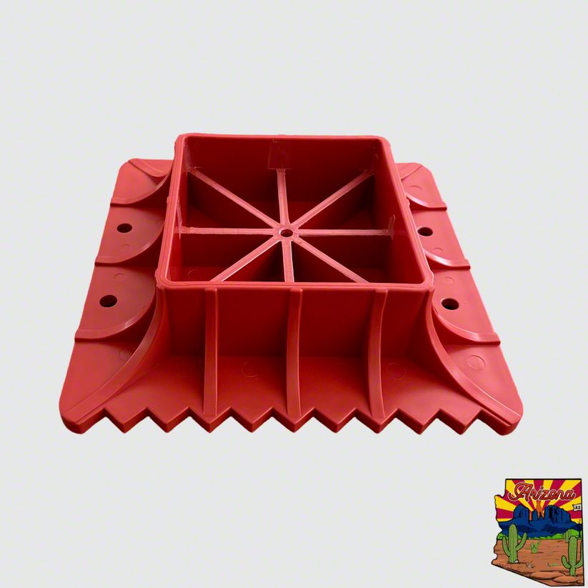 Construction and Appearance. Made from high-density polyethylene, this jack base is built to withstand heavy loads without cracking or warping. The matte red finish enhances visibility while adding a rugged, off-road look. Its 11.5x11.5x3.5-inch size provides a wide and supportive surface for improved stability.