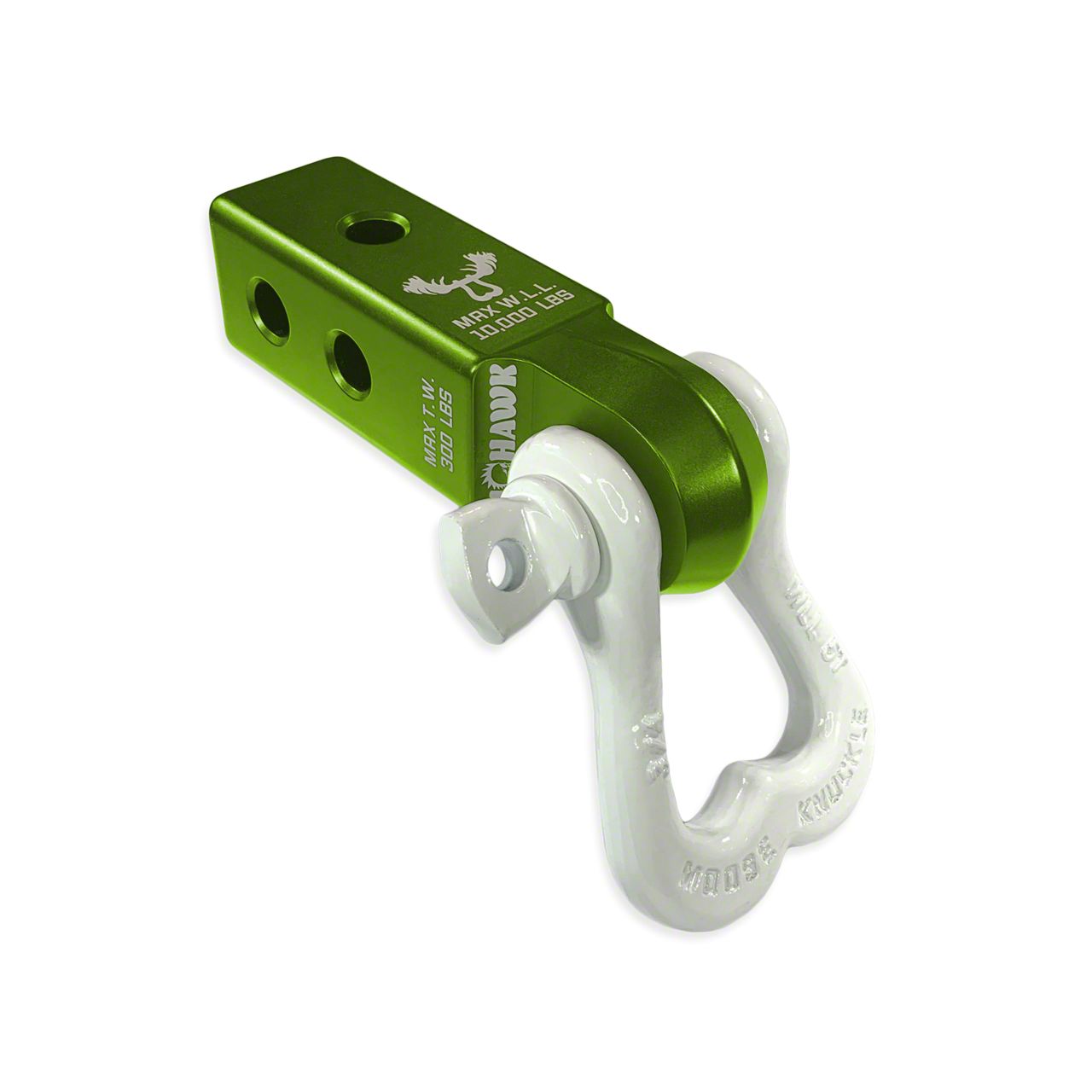 The Moose Knuckle XL fits any 2.0 or 2.5 inch D-Ring tow shackle receiver hitch bracket mount with a 7/8" (0.875") pin hole and a mount width of 1-1/2" (1.25") or less.