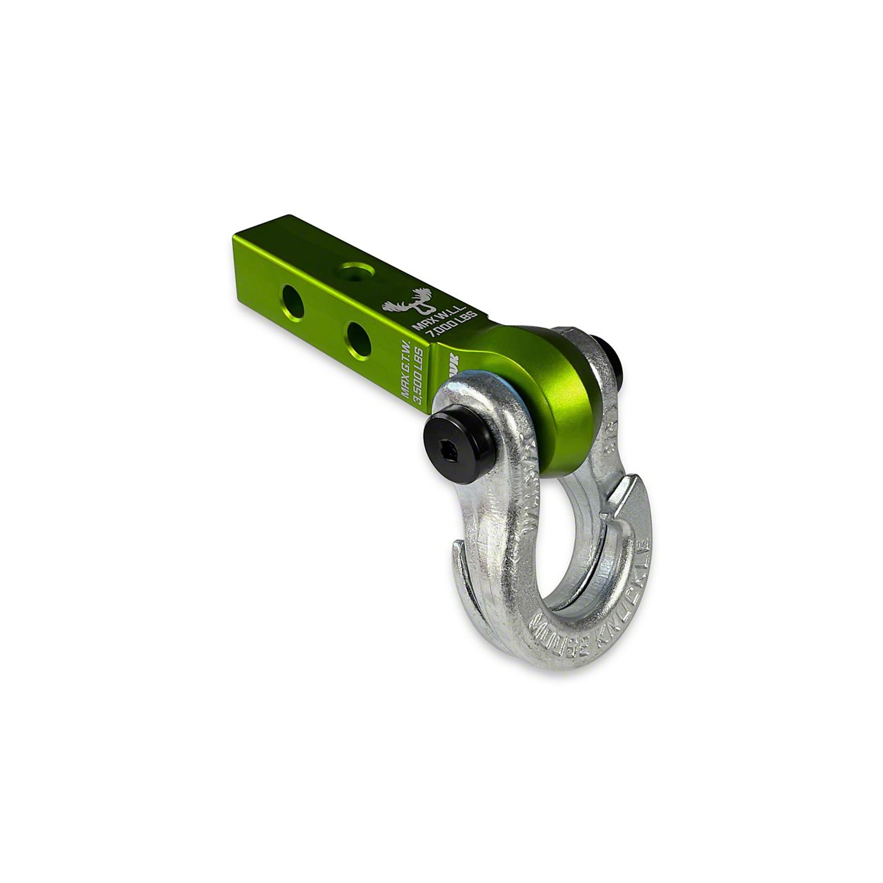 This shackle receiver set up is perfect for your SxS, UTV or ATV with a 1.25 inch hitch tube!JOWL 5/8 SPLIT SHACKLEIntroducing the "patent pending" JOWL SxS 5/8 inch recovery split shackle designed especially for smaller off-road vehicle like SxS's, ATV's and UTV's. Our innovative split "J" recovery shackle design eliminates the need for tools or soft shackles while making rope and strap connections faster eliminating the need to remove your shackles from your bumper or hitch receiver to make a connection, hook up a rope or strap out on the trail. Fast TOOL-LESS closed loop recovery finally made easy!!THIS CHANGES EVERYTHING!Just open up the Jowl shackle hooked sides, insert your recovery rope or tow strap looped end, rotate the end of the tow rope or strap to engage both sides of the shackle, pull tight and you are ready to recover your stuck vehicle.We designed our smaller 5/8 Jowl SxS with a standard bow shackle shape for those SxS, ATV, UTV and Off-roaders who prefer a more traditional shackle look on their rigs. Built in pull angle stops are visual reminders that give you feedback to help you keep your pull angles low keeping your recovery safe and as efficient as possible.The Jowl SxS Recovery Shackle fits any 1.25 or 2.0 inch tow shackle receiver, soft shackle receiver hitch bracket mount or bumper tow point with a 3/4" (0.75") pin hole and a mounting bracket width of 1 inch (1.0") or less.All color options are fully interchangeable. Buy two different color shackles and combine them to match the color scheme of your rig and give your build a more custom accented look. The hooked sides are fully covered with a durable powder coating pantone color matched to popular truck and Jeep colors. The shackle pin is Black Nickel plated and machined from High Strength Grade 8 Carbon Steel.This 3.5T (7,000 LB WLL) forged carbon steel shackle is guaranteed to speed up vehicle recovery so you can spend more time enjoying the trail instead or being stuck in it.Built in rubber anti-chatter pads stop the hooked sides from rattling against each other as you navigate the roughest trails.Each shackle includes six durable nylon shackle isolators. Two 3.0mm thick washers, two 2.0mm thick washers and two 1.0mm washers help you center your Jowl shackle on any width bumper shackle mount, gusset, wench rope or shackle receiver.We made mounting the Jowl easy. The shackle pin is secured by two Metric M14 cap screws that accept any 1/4" socket wrench. Just grab two 1/4 inch ratchets and easily remove or attach the shackle to your vehicle without the need to find the correct allen keys or hex wrenches out on the trail. (Bonus: only one screw needs to be removed to attach or remove the shackle from your vehicle adding to the speed and functionality of this design.)Mohawk Receiver 1.25 - Bean GreenHang your Moose Knuckle Offroad shackle or tow shackle from our new versatile SxS, ATV and UTV shackle hitch receiver.The Mohawk 1.25 is warm forged using 6082 aluminum with the grain flow orientated to maximize the strength of your connection point providing a work load limit of 7,000lbs.Two hitch pin holes allow for two receiver mounting positions increasing compatibility with any 1.25 inch hitch mounting tube. The third hitch pin hole and included spacer allow you to rotate the receiver 90 degrees so you can mount a hitch ball with a 3/4" shank providing a towing tongue weight limit of 300lbs and a gross trailer weight of 3,500lbs while accepting a Class I/II hitch ball.Most shackle receivers have sharp edges at the connection point which often tear soft shackles, synthetic ropes, tree savers and strap looped ends. The Mohawk 1.25 main mounting hole has a very large radius on the outer edges to reduce abrasion and increase the life of your recovery gear making this ideal for use with any closed loop recovery set up. The spined outer perimeter adds more material where you need it most and gives the Mohawk its aggressive and unique identity.Shackle Specs:Col