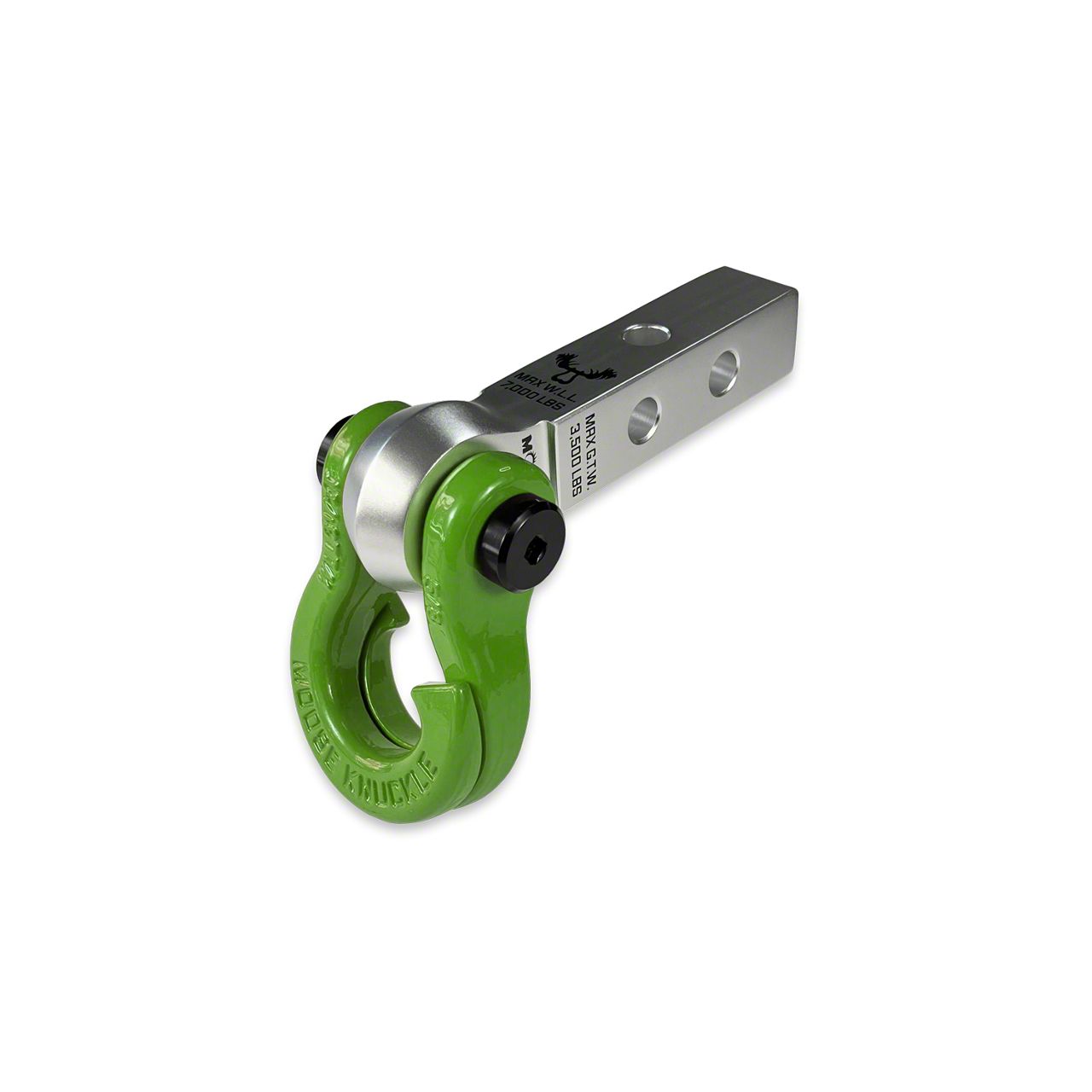 This shackle receiver set up is perfect for your SxS, UTV or ATV with a 1.25 inch hitch tube!JOWL 5/8 SPLIT SHACKLEIntroducing the "patent pending" JOWL SxS 5/8 inch recovery split shackle designed especially for smaller off-road vehicle like SxS's, ATV's and UTV's. Our innovative split "J" recovery shackle design eliminates the need for tools or soft shackles while making rope and strap connections faster eliminating the need to remove your shackles from your bumper or hitch receiver to make a connection, hook up a rope or strap out on the trail. Fast TOOL-LESS closed loop recovery finally made easy!!THIS CHANGES EVERYTHING!Just open up the Jowl shackle hooked sides, insert your recovery rope or tow strap looped end, rotate the end of the tow rope or strap to engage both sides of the shackle, pull tight and you are ready to recover your stuck vehicle.We designed our smaller 5/8 Jowl SxS with a standard bow shackle shape for those SxS, ATV, UTV and Off-roaders who prefer a more traditional shackle look on their rigs. Built in pull angle stops are visual reminders that give you feedback to help you keep your pull angles low keeping your recovery safe and as efficient as possible.The Jowl SxS Recovery Shackle fits any 1.25 or 2.0 inch tow shackle receiver, soft shackle receiver hitch bracket mount or bumper tow point with a 3/4" (0.75") pin hole and a mounting bracket width of 1 inch (1.0") or less.All color options are fully interchangeable. Buy two different color shackles and combine them to match the color scheme of your rig and give your build a more custom accented look. The hooked sides are fully covered with a durable powder coating pantone color matched to popular truck and Jeep colors. The shackle pin is Black Nickel plated and machined from High Strength Grade 8 Carbon Steel.This 3.5T (7,000 LB WLL) forged carbon steel shackle is guaranteed to speed up vehicle recovery so you can spend more time enjoying the trail instead or being stuck in it.Built in rubber anti-chatter pads stop the hooked sides from rattling against each other as you navigate the roughest trails.Each shackle includes six durable nylon shackle isolators. Two 3.0mm thick washers, two 2.0mm thick washers and two 1.0mm washers help you center your Jowl shackle on any width bumper shackle mount, gusset, wench rope or shackle receiver.We made mounting the Jowl easy. The shackle pin is secured by two Metric M14 cap screws that accept any 1/4" socket wrench. Just grab two 1/4 inch ratchets and easily remove or attach the shackle to your vehicle without the need to find the correct allen keys or hex wrenches out on the trail. (Bonus: only one screw needs to be removed to attach or remove the shackle from your vehicle adding to the speed and functionality of this design.)Mohawk Receiver 1.25 - Atomic SilverHang your Moose Knuckle Offroad shackle or tow shackle from our new versatile SxS, ATV and UTV shackle hitch receiver.The Mohawk 1.25 is warm forged using 6082 aluminum with the grain flow orientated to maximize the strength of your connection point providing a work load limit of 7,000lbs.Two hitch pin holes allow for two receiver mounting positions increasing compatibility with any 1.25 inch hitch mounting tube. The third hitch pin hole and included spacer allow you to rotate the receiver 90 degrees so you can mount a hitch ball with a 3/4" shank providing a towing tongue weight limit of 300lbs and a gross trailer weight of 3,500lbs while accepting a Class I/II hitch ball.Most shackle receivers have sharp edges at the connection point which often tear soft shackles, synthetic ropes, tree savers and strap looped ends. The Mohawk 1.25 main mounting hole has a very large radius on the outer edges to reduce abrasion and increase the life of your recovery gear making this ideal for use with any closed loop recovery set up. The spined outer perimeter adds more material where you need it most and gives the Mohawk its aggressive and unique identity.Shackle Specs: