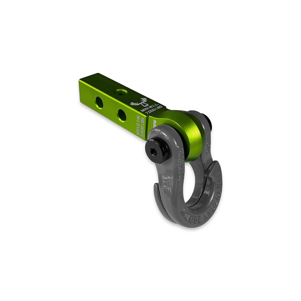 This shackle receiver set up is perfect for your SxS, UTV or ATV with a 1.25 inch hitch tube!JOWL 5/8 SPLIT SHACKLEIntroducing the "patent pending" JOWL SxS 5/8 inch recovery split shackle designed especially for smaller off-road vehicle like SxS's, ATV's and UTV's. Our innovative split "J" recovery shackle design eliminates the need for tools or soft shackles while making rope and strap connections faster eliminating the need to remove your shackles from your bumper or hitch receiver to make a connection, hook up a rope or strap out on the trail. Fast TOOL-LESS closed loop recovery finally made easy!!THIS CHANGES EVERYTHING!Just open up the Jowl shackle hooked sides, insert your recovery rope or tow strap looped end, rotate the end of the tow rope or strap to engage both sides of the shackle, pull tight and you are ready to recover your stuck vehicle.We designed our smaller 5/8 Jowl SxS with a standard bow shackle shape for those SxS, ATV, UTV and Off-roaders who prefer a more traditional shackle look on their rigs. Built in pull angle stops are visual reminders that give you feedback to help you keep your pull angles low keeping your recovery safe and as efficient as possible.The Jowl SxS Recovery Shackle fits any 1.25 or 2.0 inch tow shackle receiver, soft shackle receiver hitch bracket mount or bumper tow point with a 3/4" (0.75") pin hole and a mounting bracket width of 1 inch (1.0") or less.All color options are fully interchangeable. Buy two different color shackles and combine them to match the color scheme of your rig and give your build a more custom accented look. The hooked sides are fully covered with a durable powder coating pantone color matched to popular truck and Jeep colors. The shackle pin is Black Nickel plated and machined from High Strength Grade 8 Carbon Steel.This 3.5T (7,000 LB WLL) forged carbon steel shackle is guaranteed to speed up vehicle recovery so you can spend more time enjoying the trail instead or being stuck in it.Built in rubber anti-chatter pads stop the hooked sides from rattling against each other as you navigate the roughest trails.Each shackle includes six durable nylon shackle isolators. Two 3.0mm thick washers, two 2.0mm thick washers and two 1.0mm washers help you center your Jowl shackle on any width bumper shackle mount, gusset, wench rope or shackle receiver.We made mounting the Jowl easy. The shackle pin is secured by two Metric M14 cap screws that accept any 1/4" socket wrench. Just grab two 1/4 inch ratchets and easily remove or attach the shackle to your vehicle without the need to find the correct allen keys or hex wrenches out on the trail. (Bonus: only one screw needs to be removed to attach or remove the shackle from your vehicle adding to the speed and functionality of this design.)Mohawk Receiver 1.25 - Bean GreenHang your Moose Knuckle Offroad shackle or tow shackle from our new versatile SxS, ATV and UTV shackle hitch receiver.The Mohawk 1.25 is warm forged using 6082 aluminum with the grain flow orientated to maximize the strength of your connection point providing a work load limit of 7,000lbs.Two hitch pin holes allow for two receiver mounting positions increasing compatibility with any 1.25 inch hitch mounting tube. The third hitch pin hole and included spacer allow you to rotate the receiver 90 degrees so you can mount a hitch ball with a 3/4" shank providing a towing tongue weight limit of 300lbs and a gross trailer weight of 3,500lbs while accepting a Class I/II hitch ball.Most shackle receivers have sharp edges at the connection point which often tear soft shackles, synthetic ropes, tree savers and strap looped ends. The Mohawk 1.25 main mounting hole has a very large radius on the outer edges to reduce abrasion and increase the life of your recovery gear making this ideal for use with any closed loop recovery set up. The spined outer perimeter adds more material where you need it most and gives the Mohawk its aggressive and unique identity.Shackle Specs:Col
