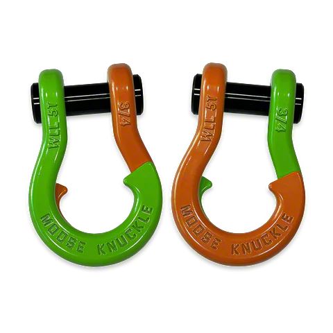 Accommodates Heavy Loads Safely. Rated for serious duty, the Moose Knuckle Offroad Jowl Split Recovery Shackle 3/4 Combo; Sublime Green/Obscene Orange is built to handle the stress of off-road winching and recovery missions. The robust ¾-inch body and load-rated clevis pin are engineered to endure high tensile forces, providing the strength needed for Jeep, truck, or UTV recovery operations.