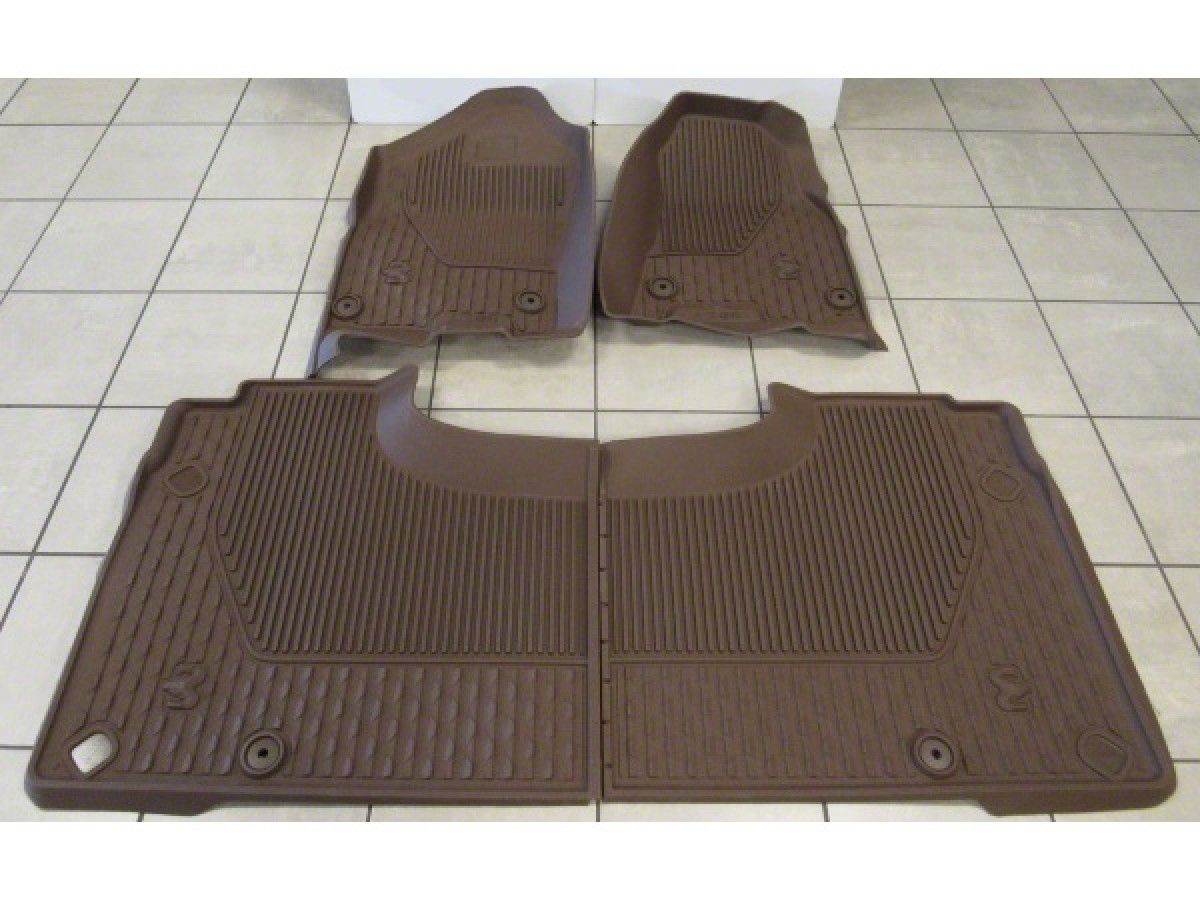 Construction and Appearance. These floor mats are crafted from durable molded plastic with a dark brown finish, offering superior resistance to wear and tear. Featuring a distinctive RAM Head logo design, they provide a rugged, custom look while complementing your truck's interior aesthetics.