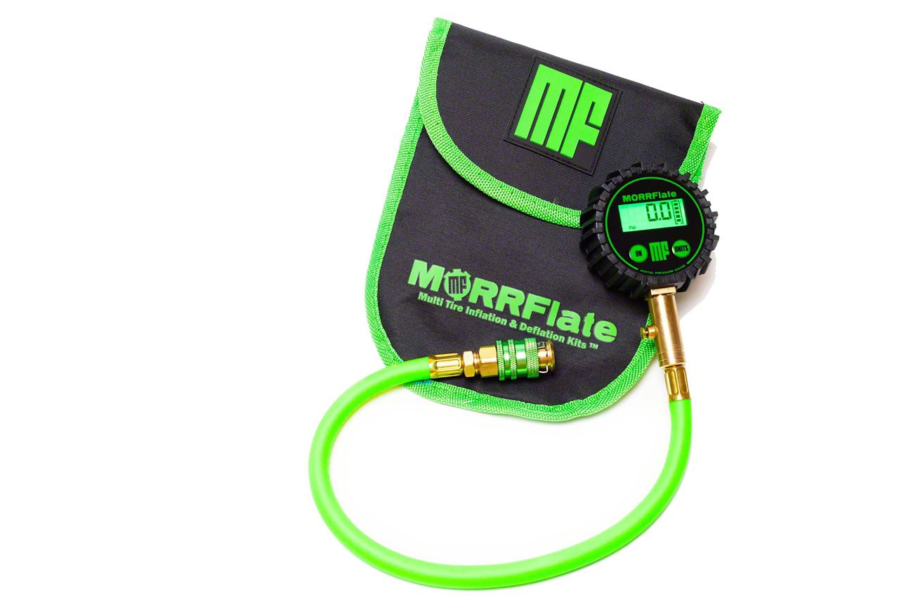 We have made our single tire gauges even better! Our new Flexi Pressure Pro comes ready to check pressures all day, every day, in any condition, in any environment. The Flexi Pressure Pro comes with our standard 1-150 PSI digital gauge, with 1% accuracy, a purge valve, 12" of our special neon green MORRFlate Hose, and our proprietary MORRFlate air chuck to be able to hook onto any valve stem out there.What really makes the Flexi Pressure Pro shine, is the new carrying bag that we put together for it!It is 600D poly with a softer cloth edge material for better handling, and it comes equipped with a rip away molle panel for your storage and ease-of-access needs when you are out in the dirt and need to check some pressures!