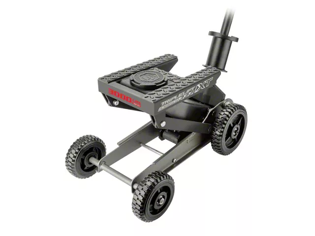 When choosing tools and equipment, versatility is essential. Having one jack perform multiple functions earns its space in the shop or off-road rig. The Powerbuilt 3000 Lb. Big Wheeled Triple Lift Jack is three jacks in one! This innovative jack has a patented design that lets you lift trucks, ATVs, and motorcycles with ease on or off the pavement. The steel framed jack has a bottom skid plate to keep the jack stable and level on soft surfaces like sand or gravel. The large wheels make this jack easy to maneuver on any surface, whether off-road, on-road, or in a shop. The Triple Lift has a patented flexible design that features both a removable lift saddle and padded lift rails allowing the Triple Lift to adapt to multiple types of vehicle frames. A locking safety bar holds the raised jack in place, which eliminates the hassle of supporting a lifted vehicle with jack stands.