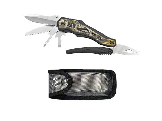 The 10-in-1 Real Tree Multi-Tool is unlike any multi-tool you've ever seen or owned. Designed for hard use in the outdoors, indoors, on the job site, or in the event of an emergency. It’s BIG and features a springloaded TPR comfort handle full-sized pliers for auto kickback for each squeeze, gripping, holding, and twisting without warping. The 3-inch semi-serrated blade has the strength and mettle of a quality folding knife and cuts through wood, hose, rope, cord, and more with ease. Combined with 8 more everyday durable stainless steel tools, including the all-important bottle opener, two screwdriver heads, saw, file, wire cutter, crimper, and glass breaker. There is no other tool like the Real Tree 10-in-1 Multi-Tool. Comes in a nylon carrying case.