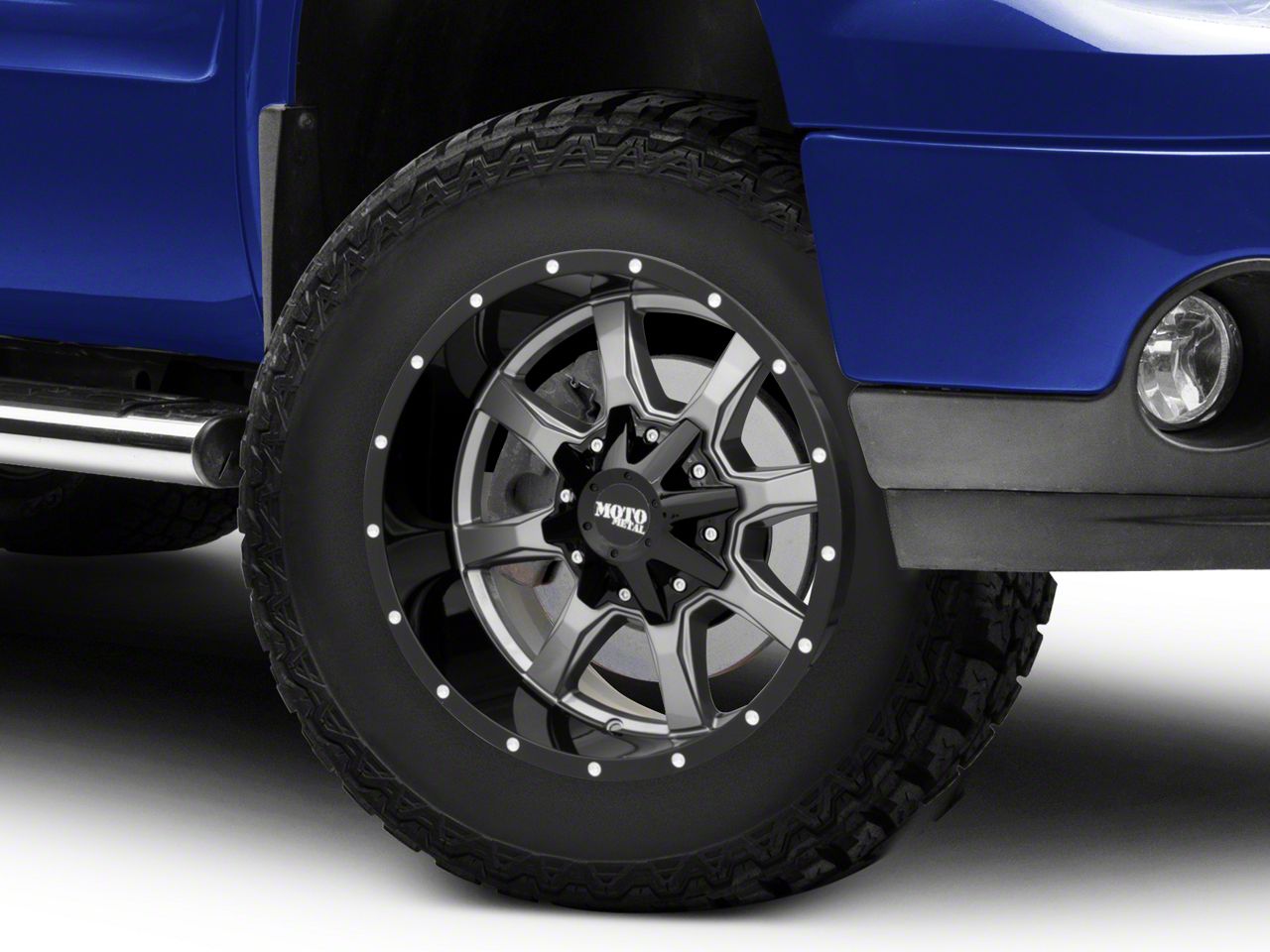 Moto Metal MO970 Gloss Gray with Gloss Black Lip 6-Lug Wheel; 18x10; -24mm Offset: Immerse your vehicle in style and elegance with this wheel's captivating matte black finish. The unique 10-hole design of this Mammoth wheel sets your vehicle apart, making a statement on the road. Whether cruising the city streets or heading out for a weekend escape, this wheel complements a wide range of vehicle styles.