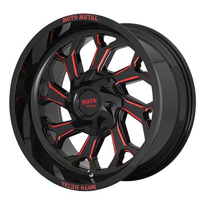 This 20x10 Moto Metal MO999 Gloss Black Milled with Red Tint 6-Lug Wheel is completed in a high-quality, gloss black finish with red steel milled accents that will be the envy of everyone. There's a durable clear coat that protects against driving hazards.