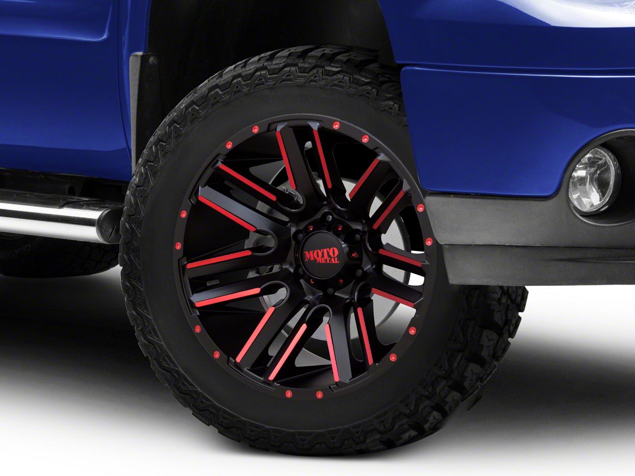 Application. This Moto Metal Razor Satin Black Machined Red Tint 6-Lug Wheel; 20x10; -24mm Offset with a backspace of 4.556 Inch, 115.8mm; and bolt pattern of 6 x 139.7mm (6 x 5.5-Inch) contributes to impeccable alignment and driving stability. Designed to fit 2007-2013 Sierra 1500 models, sold individually.