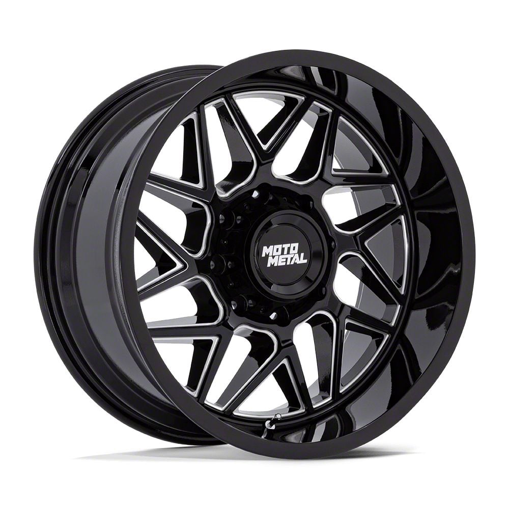 This 20x9 Moto Metal Turbine Gloss Black Milled 8-Lug Wheel is completed in a high-quality gloss black finish with steel milled accents that will create a striking appearance. There's a durable clear coat that protects against driving hazards.