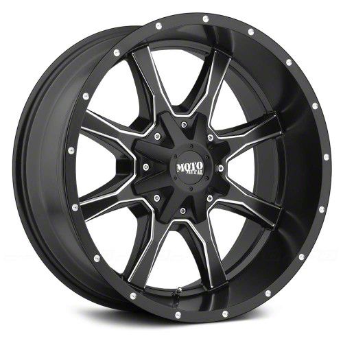 This 20x12 Moto Metal MO970 Semi Gloss Black Milled 8-Lug Wheel is completed in a high-quality gloss black finish with steel milled accents that will be the envy of everyone. There's a durable clear coat that protects against driving hazards.