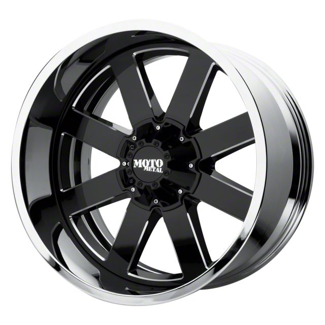 Gloss Black Milled Finish with Chrome Lip. This 20x12 Moto Metal Wheels MO200 Series Wheel is completed in a high quality black milled finish with a bright chrome lip for striking contrast in appearance that everyone will envy. For added protection and good looks, this Wheel features a durable, gloss clear coat that is tough enough to stand up against the hazards of everyday driving - including road chips and pitting.