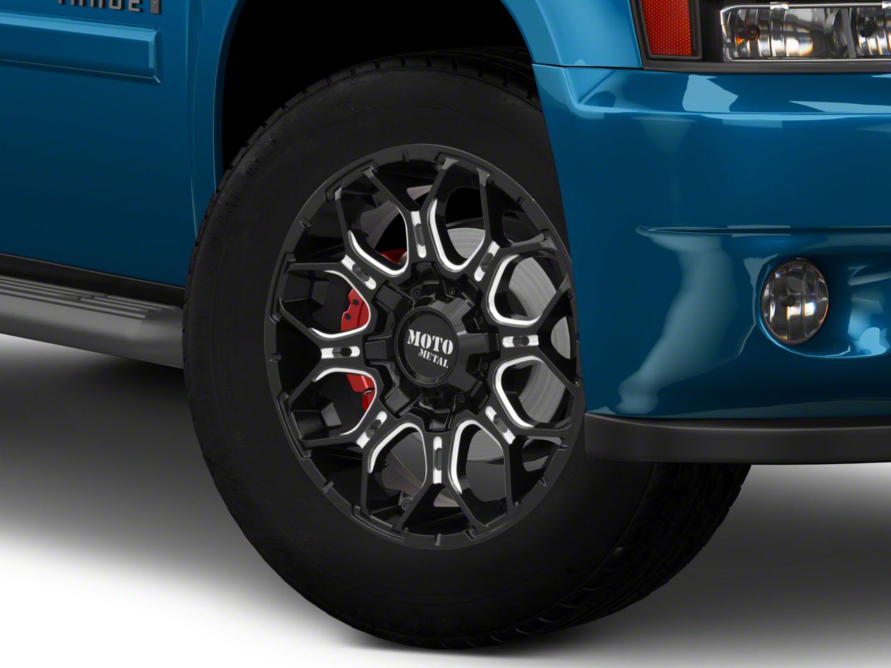 Application. This Moto Metal MO808 Sniper Gloss Black Milled 6-Lug Wheel; 20x9; 0mm Offset with a backspace of 5 Inch, 127mm; and bolt pattern of 6 x 139.7mm (6 x 5.5-Inch) contributes to impeccable alignment and driving stability. Designed to fit 2007-2014 Tahoe models, sold individually.