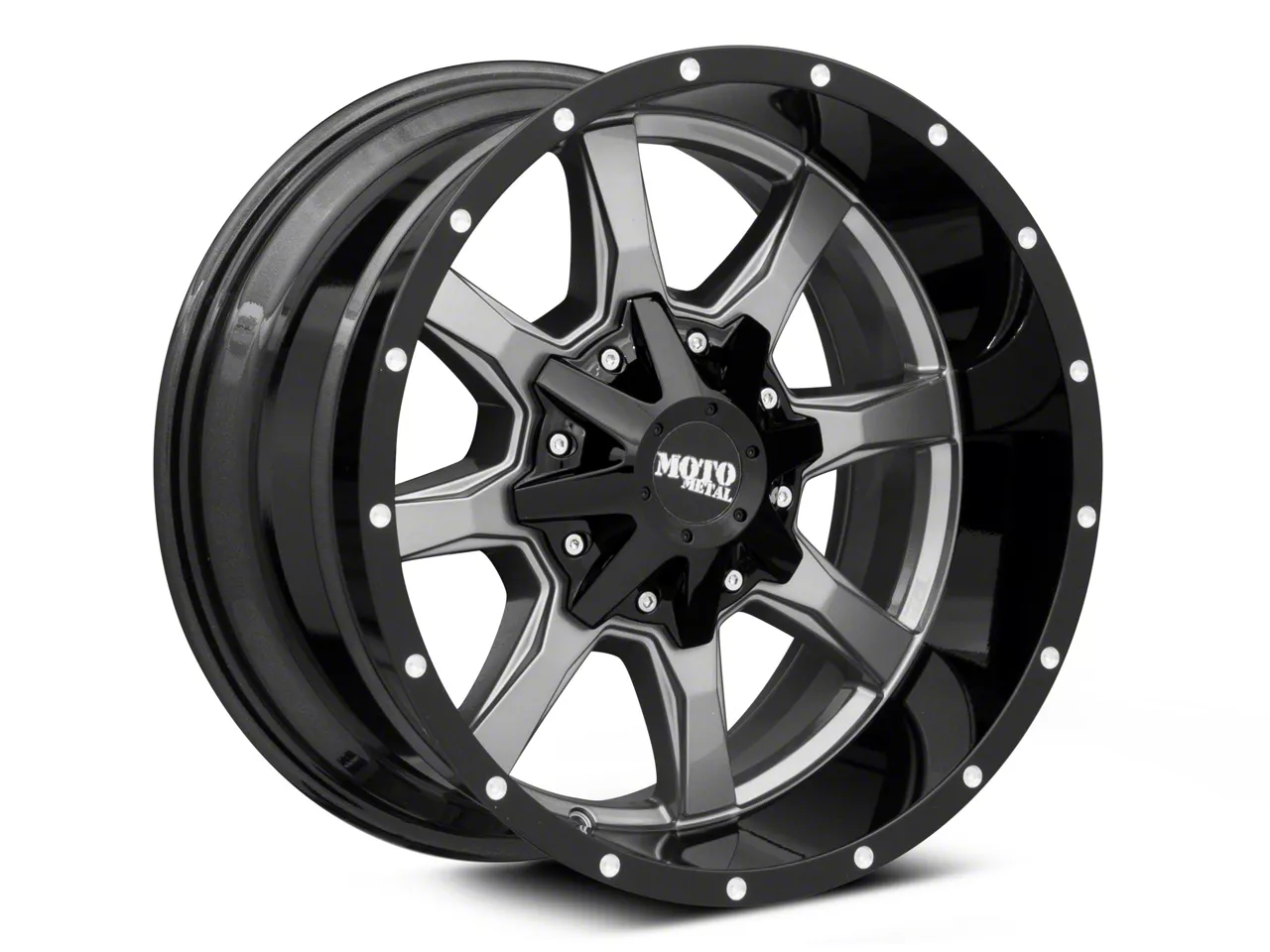 Moto Metal MO970 Gloss Gray with Gloss Black Lip 6-Lug Wheel; 18x10; -24mm Offset: Immerse your vehicle in style and elegance with this wheel's captivating matte black finish. The unique 10-hole design of this Mammoth wheel sets your vehicle apart, making a statement on the road. Whether cruising the city streets or heading out for a weekend escape, this wheel complements a wide range of vehicle styles.