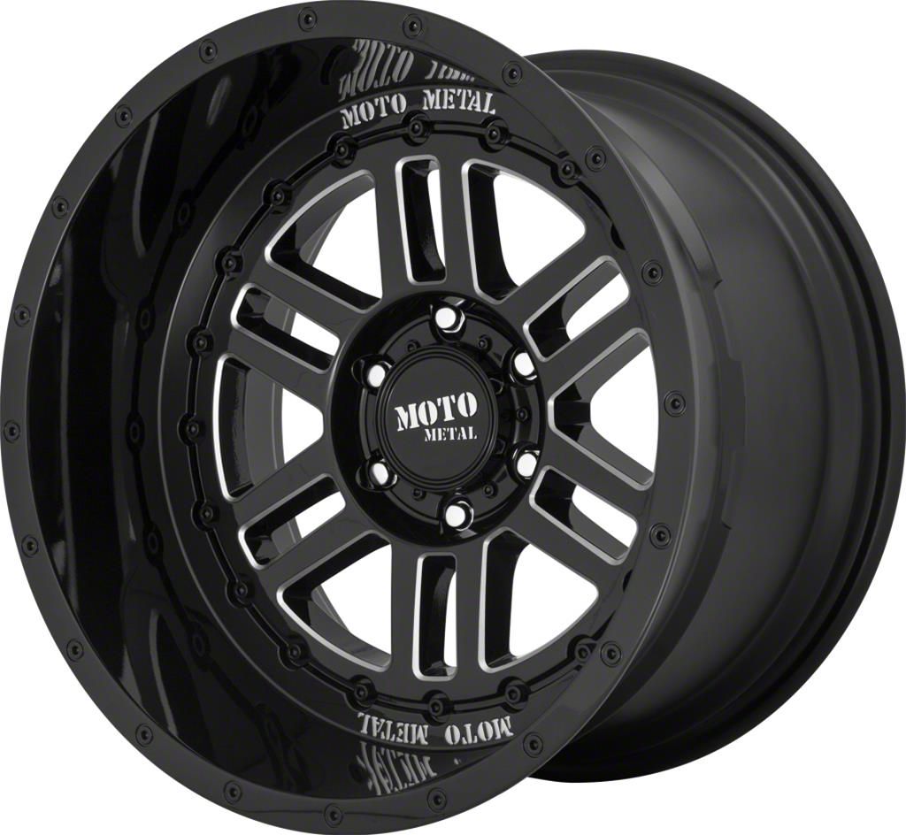 This 22x12 Moto Metal MO800 Deep Six Gloss Black Milled 8-Lug Wheel is completed in a high-quality gloss black finish with steel milled accents that will be the envy of everyone. There's a durable clear coat that protects against driving hazards.