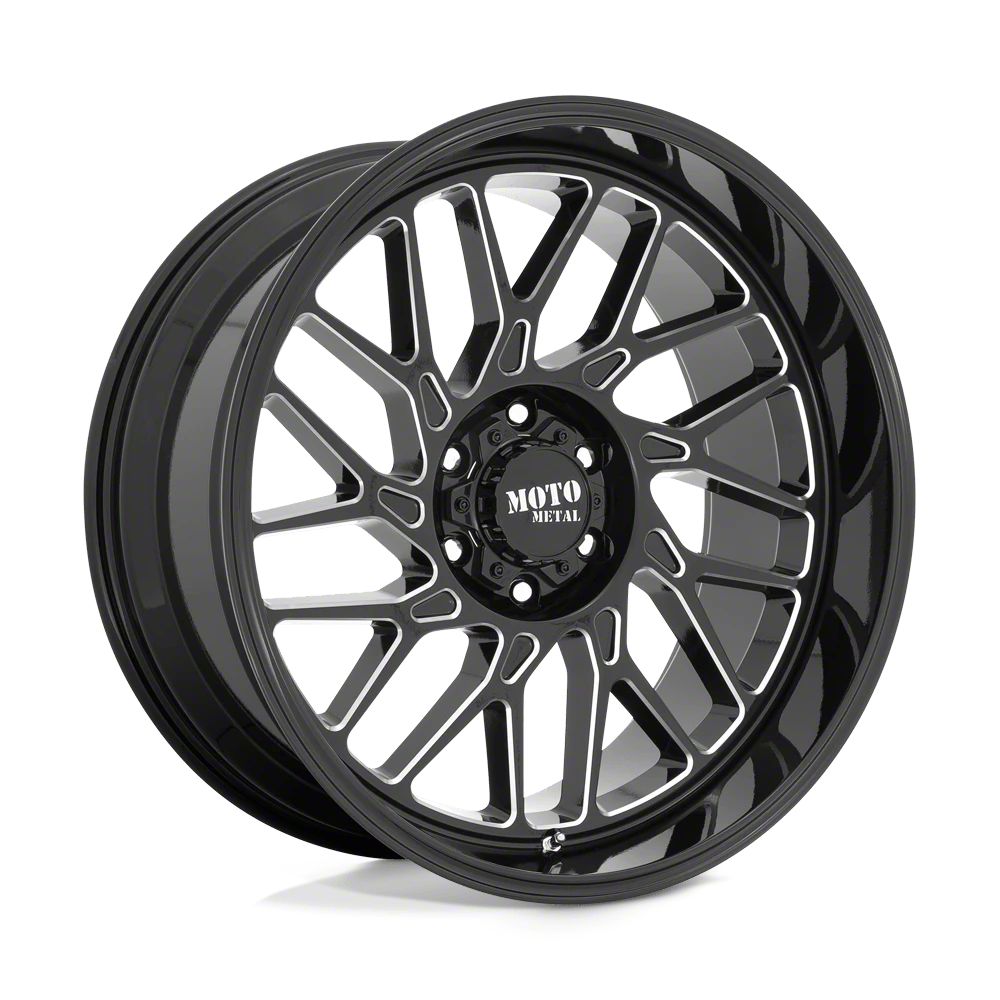Moto Metal MO805 Gloss Black Milled 8-Lug Wheel; 20x10; -18mm Offset The Moto Metal MO805 Gloss Black Milled 8-Lug Wheel combines a sleek, sophisticated design with premium construction that enhances the visual appeal and complements a wide range of vehicle styles. This wheel is perfect for those seeking to make a bold statement while maintaining elegance and robustness.
