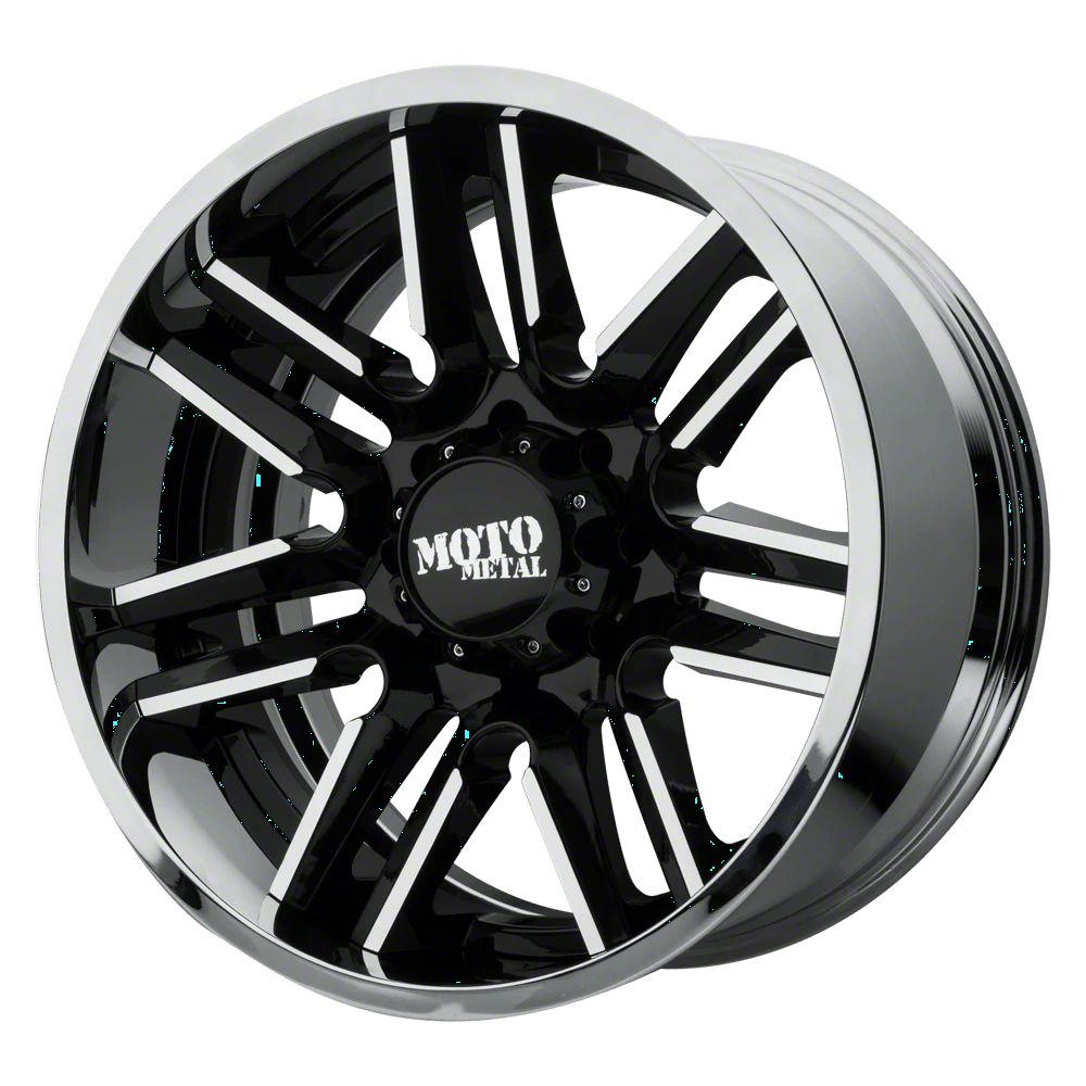 Moto Metal MO202 Gloss Black Machined Center with Chrome Lip 8-Lug Wheel; 20x10; -18mm Offset The Moto Metal MO202 Gloss Black Machined Center with Chrome Lip 8-Lug Wheel combines a sleek, sophisticated design with premium construction that enhances the visual appeal and complements a wide range of vehicle styles. This wheel is perfect for those seeking to make a bold statement while maintaining elegance and robustness.