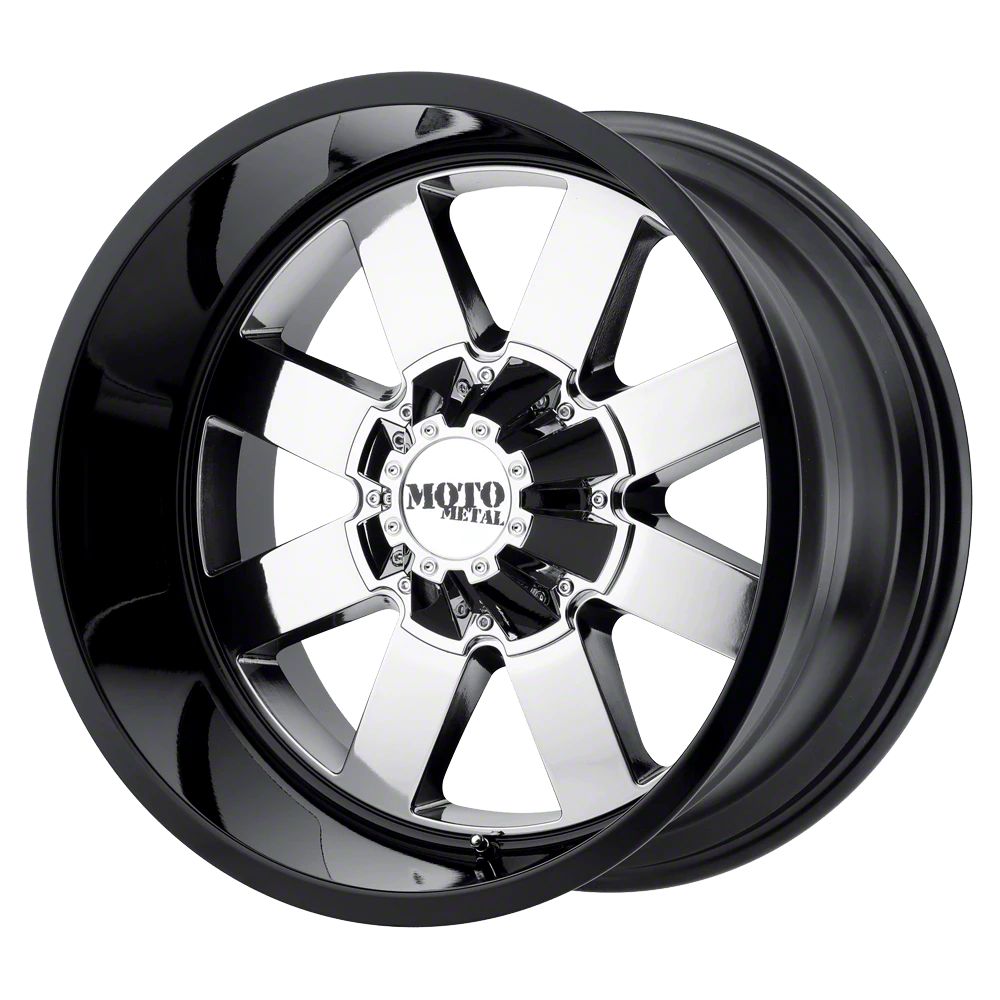 The 20x12 Moto Metal MO962 PVD Chrome Center with Gloss Black Lip 8-Lug Wheel is completed in a high-quality chrome finish with gloss black milled accents for an aggressive appearance that will turn heads. This wheel features a durable clear coat that stands up to the hazards of everyday driving.