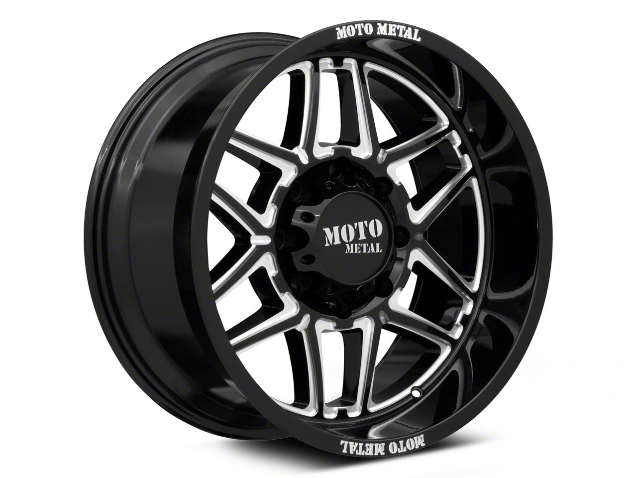 Moto Metal Folsom Gloss Black Milled 8-Lug Wheel; 20x10; -18mm Offset The Moto Metal Folsom Gloss Black Milled 8-Lug Wheel combines a sleek, sophisticated design with premium construction that enhances the visual appeal and complements a wide range of vehicle styles. This wheel is perfect for those seeking to make a bold statement while maintaining elegance and robustness.