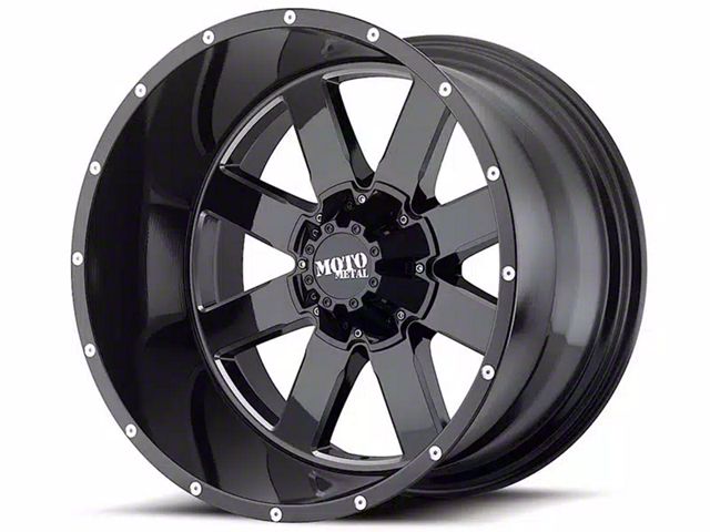 The 20x12 Moto Metal MO962 Gloss Black Milled 8-Lug Wheel is given a gloss black finish to keep the wheel looking as sharp as its design. This wheel's milled steel accents are really where it shines through, and quite literally. It makes the split section of the spokes pop along the faux beadlock.