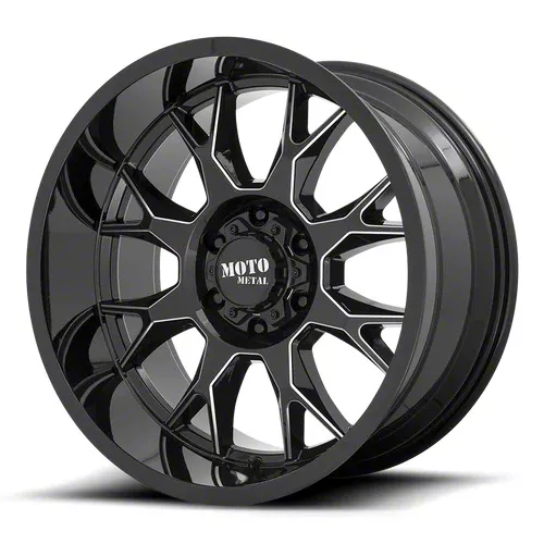 This 20x9 Moto Metal MO806 Gloss Black Milled 8-Lug Wheel is completed in a high-quality gloss black finish with steel milled accents that will create a striking appearance. There's a durable clear coat that protects against driving hazards.