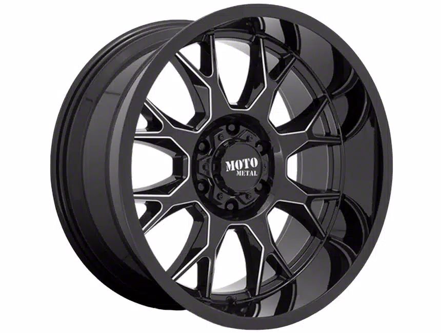 This 20x9 Moto Metal MO806 Gloss Black Milled 5-Lug Wheel is completed in a high-quality gloss black finish with steel milled accents that will be the envy of everyone. For added protection and looks, there is a durable clear coat that can handle the rigors of daily driving.